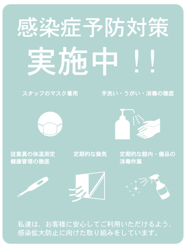 私達スタッフは、新型コロナ等感染予防及び拡散防止の為、サービス中はマスクを着用させて頂きます。また、手洗い、うがい、検温、その他体調確認を徹底しております。